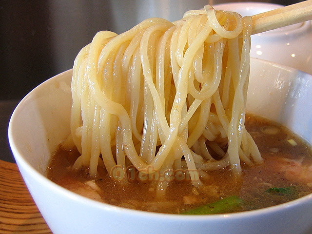 さらに、すする際に「チュルチュルチュル・・・・」「ジョボジョボジョボ・・・・」と、連続して「水の音」が聞こえて来そうなほど思い切り「超」多加水であり、加えて包丁や切り刃で裁断した四角さを全く感じさせない「完全なる円」の断面を持つ麺は・・・・それゆえ無類の丸〜い口当たりを生むため、極端に言えば「水」が円筒形に造形されたサムシングを食べているイメージとさえ言える。